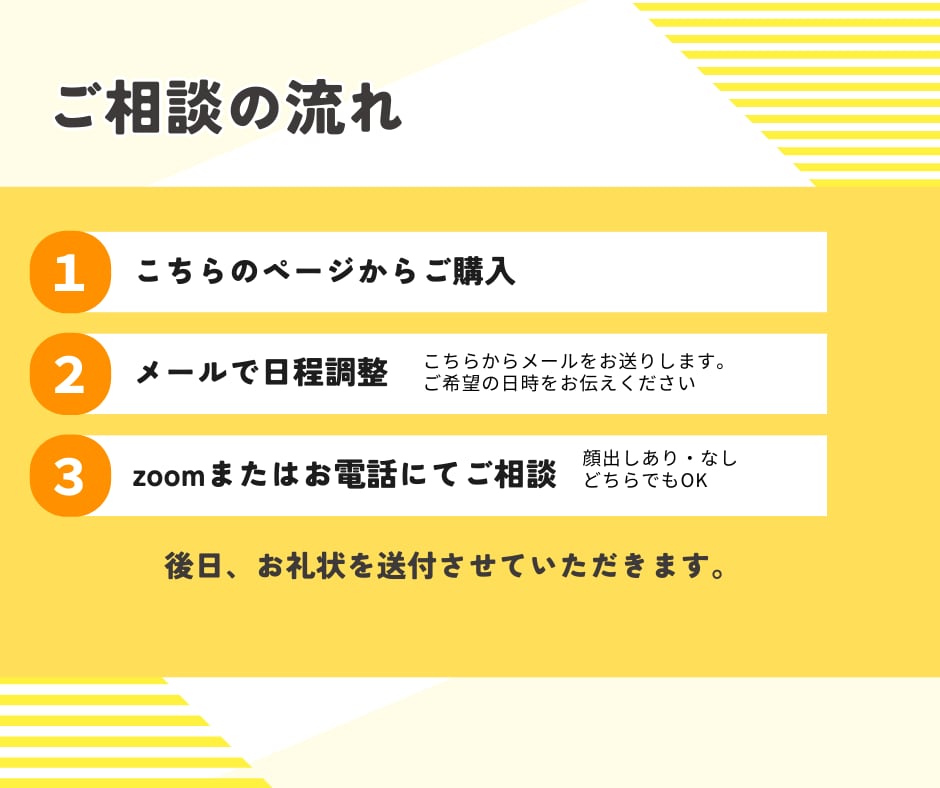 購入後にメールにてご相談時間を打ち合わせさせていただきます。スケジュールの調整をお願いいたします。