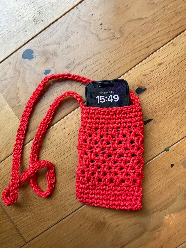税理士ヨッシーの妻、ヨメッシーが編んだスマホポーチです。 元気の出るビビットなカラーがファッションのアクセントに。 レーヨン素材の糸で編んでいます。毛糸に比べてしっかりとしていて丈夫です。 多少伸び縮みします。 スマホプラス小さな財布が入ります。 「ヨメッシーのハンドメイドへのチャレンジ」 ヨメッシーの手しごとシリーズです。 ⸻ 商品詳細 サイズ:縦17.5cm × 横11.5cm 素材:レーヨン95%ナイロン5% カラー:レッド ご注文いただいてからの受注生産となります。できる限り早めに編みますが、多くのご注文をいただいた場合、発送までに1〜2週間程度かかることもあります。   【ご購入の際の注意点】 ・すべて手作業で制作しているため、編み目やサイズに個体差がございます。 ・お使いのモニターや照明の環境により、色味が実物と異なる場合があります。 ・スマホの機種やケースの厚みによっては、サイズが合わない場合がありますのでご確認ください。 ・気持ちのよいお取引のため、気になる点がありましたらご購入前にお問い合わせください。 ⸻ 【梱包について】 環境に配慮し、簡易包装でお届けしております。